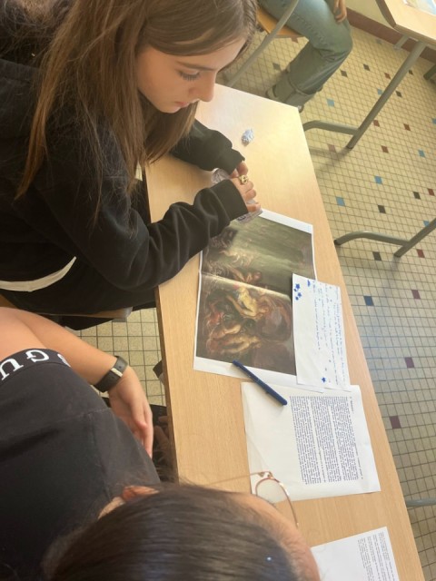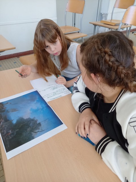 La séance suivante est menée par Antoine. Casque sur les oreilles et yeux rivés sur une photo de l’œuvre, les élèves doivent choisir, dans une banque de sons élaborée par notre sound designer, ceux qu'ils jugent les plus pertinents pour créer l'ambiance sonore du tableau. Par exemple, quel son pour signifier le raclement d'une chaise sur le parquet pour le Portrait de Lacépède ? Quels cris des animaux pour la Vue du château de Véretz ? Comment faire entendre le bruit des vagues pour la Vue des bords de Méditerranée, ou bien encore le roulement des rochers pour Le Triomphe de Galatée ?