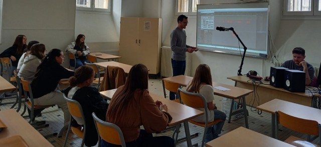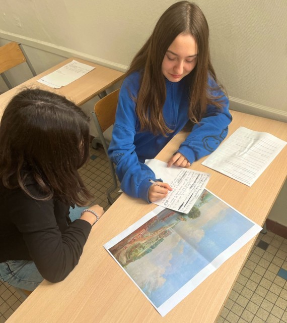 La séance suivante est menée par Antoine. Casque sur les oreilles et yeux rivés sur une photo de l’œuvre, les élèves doivent choisir, dans une banque de sons élaborée par notre sound designer, ceux qu'ils jugent les plus pertinents pour créer l'ambiance sonore du tableau. Par exemple, quel son pour signifier le raclement d'une chaise sur le parquet pour le Portrait de Lacépède ? Quels cris des animaux pour la Vue du château de Véretz ? Comment faire entendre le bruit des vagues pour la Vue des bords de Méditerranée, ou bien encore le roulement des rochers pour Le Triomphe de Galatée ?
