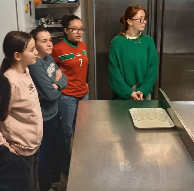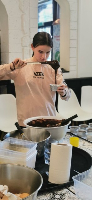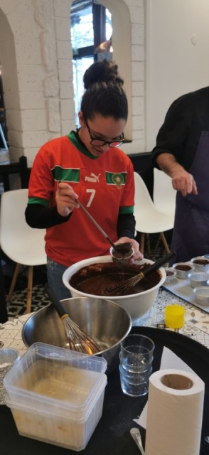 Christophe a commencé par nous montrer les ingrédients que nous allions utiliser : les œufs, la farine, le sucre, le beurre et le chocolat. On a commencé à cuisiner. Pendant que Sheyene, Margelin et Eden ont cassé les œufs, Christophe a mis le chocolat et le beurre à fondre pour la suite. Après avoir fini l'étape des œufs, on a continué avec la farine, le sucre, le beurre et pour finir le chocolat. Différents élèves ont mélangé tout en s'amusant, puis nous avons beurré les moules individuels grâce à un spray pour beurrer plus vite. Après avoir versé la préparation dans les moules, nous sommes allés dans la cuisine pour les faire cuire et avons discuté avec Christophe.