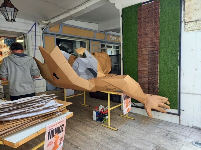 Stéphane Munoz explique sa technique : élaboration du plan en 3D sur ordinateur, décomposition en plans 2D pour en extraire les surfaces à découper, création des patrons, découpage et pliage des cartons, puis chaque pièce est reportée sur du carton, découpée, pliée, et patiemment collée, pour reconstituer la forme finale. Chaque sculpture est un puzzle géant qui peut, lorsqu'il est terminé, être décoré (peinture, papier...) avant d'être recouvert de résine pour résister à l'exposition en extérieur.
