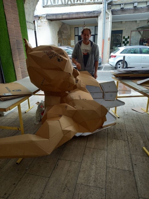 Nous rencontrons l'artiste qui nous présente l'œuvre qu'il achèvera en fin de semaine , un gigantesque singe qui soutiendra une arche sous les cornières avant d'être exposé dans une salle de la ville.